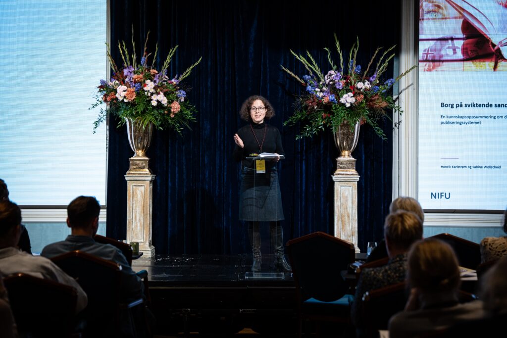 NIFUs Sabine Wollscheid presenterer NIFUs nye rapport om utfordringer for forsknings- og publiseringssystemet på Forskerforbundets forskningspolitiske seminar på Hotel Bristol.